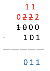 - 0에서 1을 빼려면 왼쪽에서 가장 가까운 1을 빌린다. 빌려준 값은 0이 되고 빌린 값은 2가 되어, 거기서 1을 빼 1이 남는다.