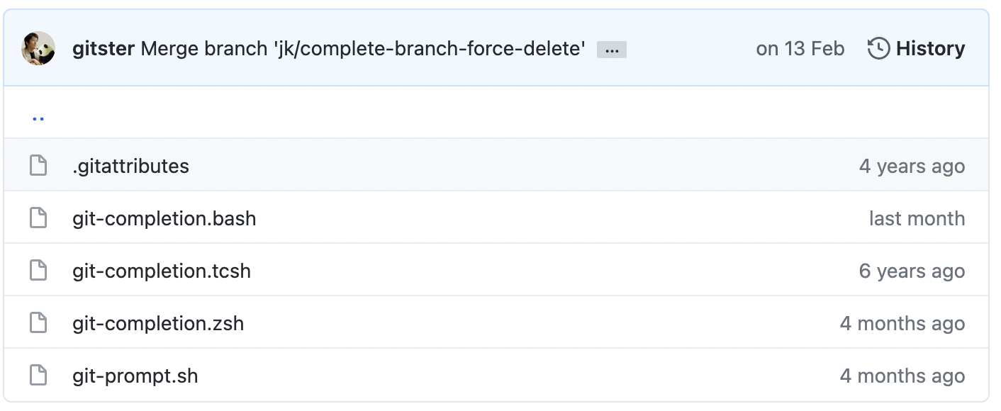 Git 커뮤니티는 모든 shell의 자동완성 스크립트를 GitHub 저장소에 보관하고 있다. 해당 저장소를 확인해보면 bash와 zsh를 포함한 여러 shell을 위한 스크립트가 있다.